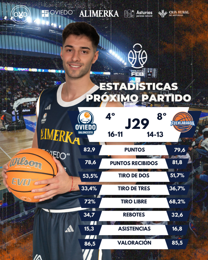 El Alimerka Oviedo Baloncesto recibe mañana en el Palacio de los Deportes (19 horas, LaLiga+) a Flexicar Fuenlabrada en la disputa de la vigésimo novena jornada de la Primera FEB 25/26. Todavía hay entradas disponibles y pueden adquirirse aquí.
