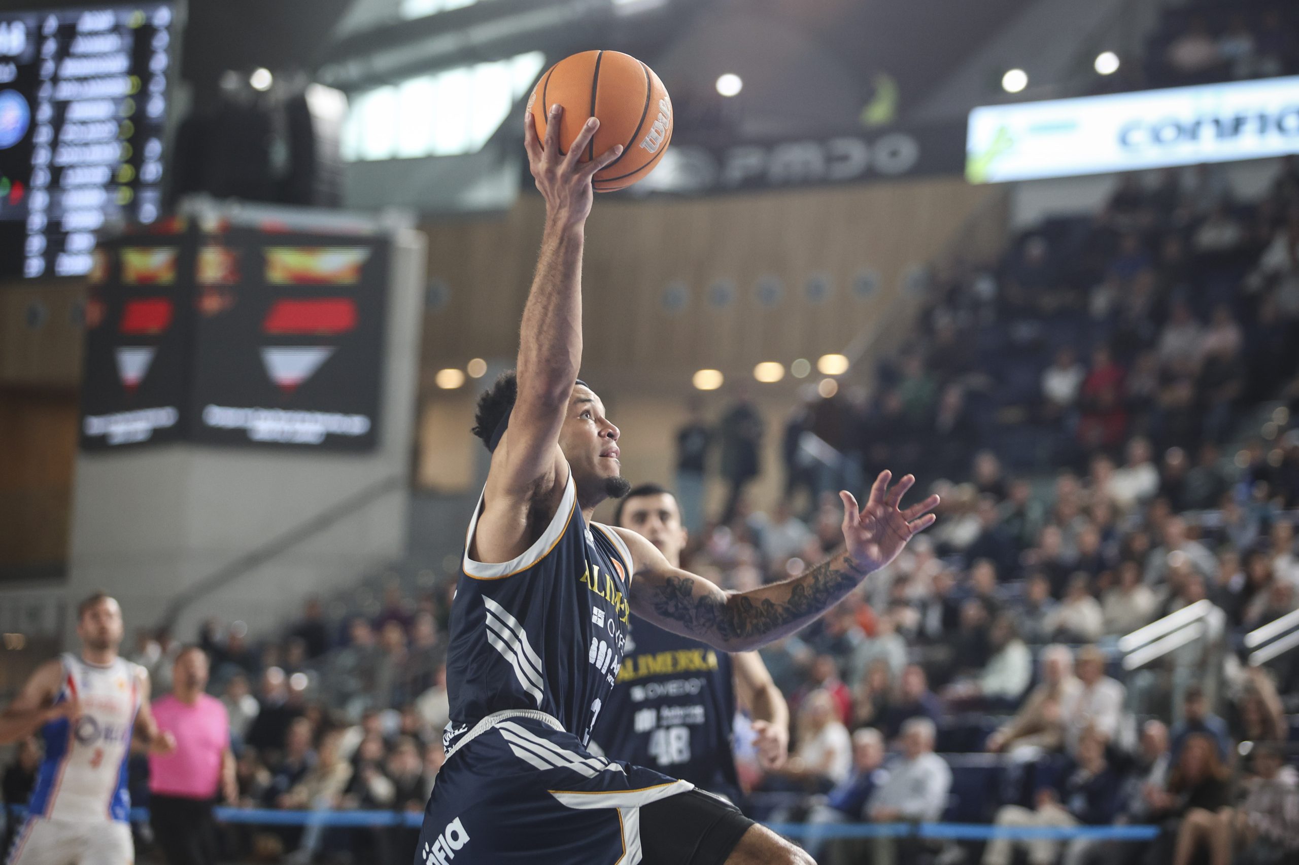 La primera parte del encuentro fue de dominio claro por parte del OCB, que logró unas rentas superiores a los 10 puntos gracias a hombres como Ignacio Rosa, Davis Geks, Oliver Arteaga o Antón Bouzán, quien sumó un triple sobre la bocina para finalizar el primer cuarto con 16-29 en el marcador. Ya en el segundo período, el Liberbank Oviedo Baloncesto logró una máxima diferencia de 16 puntos, provocando un tiempo muerto local mediado el cuarto (4:27 para el descanso). La pausa surtió su efecto, y los andaluces recortaron distancias, aunque dos tiros libres de Víctor Pérez cerraban la primera parte con 29-40 en el electrónico.