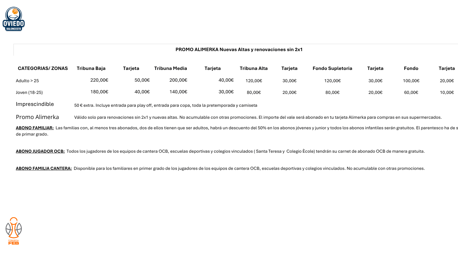 Para ello, el club ha diseñado una campaña ambiciosa, prestando atención al verdadero corazón del Alimerka Oviedo Baloncesto: nuestros abonados. Aquellos que, temporada tras temporada, han permanecido a nuestro lado, en los buenos momentos y también en los más difíciles. Gracias a su fidelidad y compromiso hemos podido competir al máximo nivel y hoy, gracias a ellos, estamos en condiciones de dar este salto histórico hacia el Palacio de los Deportes. Asimismo, el club también ha tratado de hacerla atractiva a muchos ovetenses y asturianos que no han tenido la oportunidad de conocer lo que significa el OCB.
