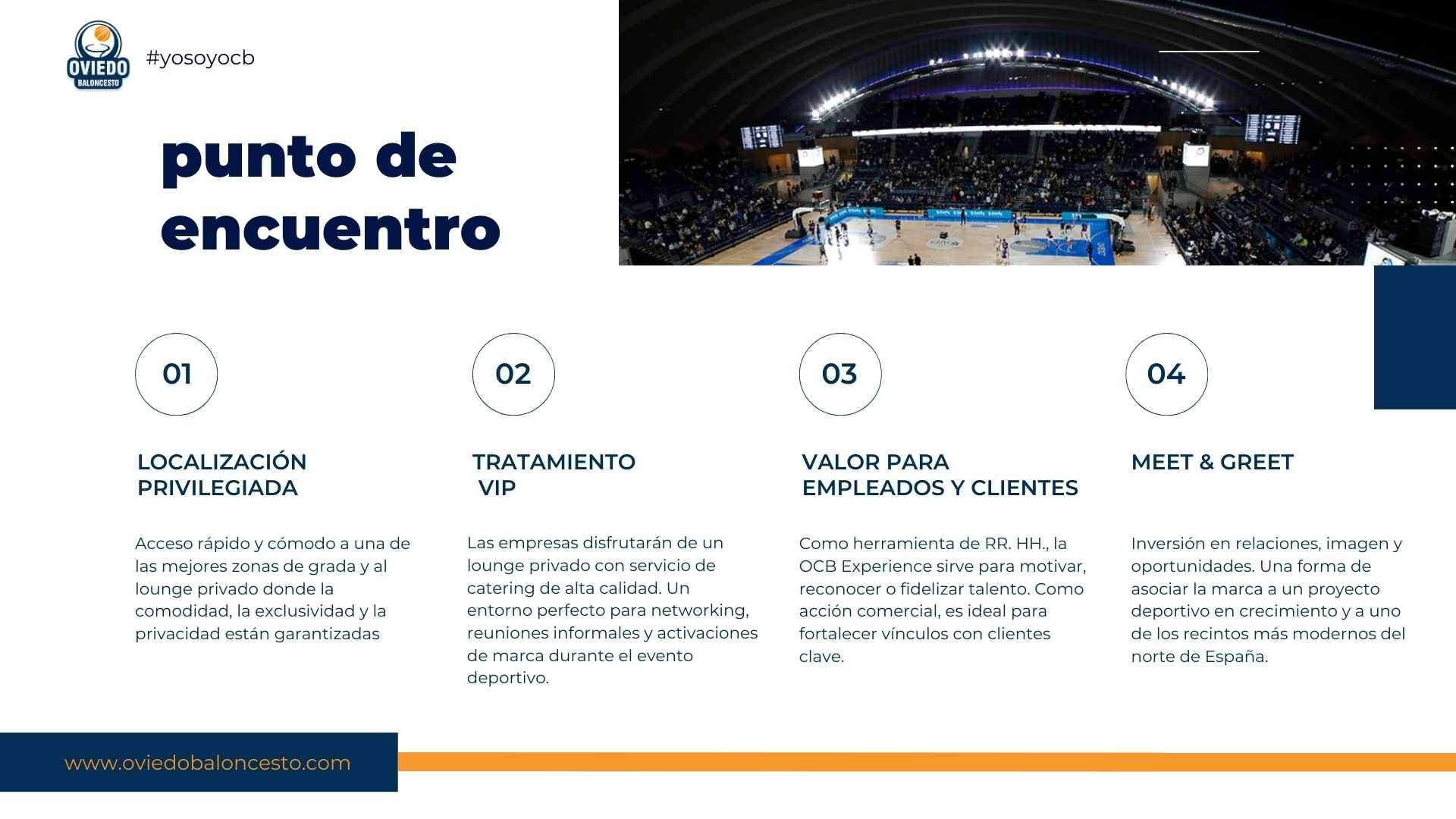 El nuevo Palacio de los Deportes de Oviedo abre una oportunidad única para que empresas, clientes y/o empleados vivan el baloncesto de élite desde una perspectiva exclusiva. La OCB Experience del Alimerka Oviedo Baloncesto ofrece una vivencia premium diseñada para fortalecer relaciones corporativas, generar nuevas oportunidades comerciales y crear momentos memorables para empleados y clientes.