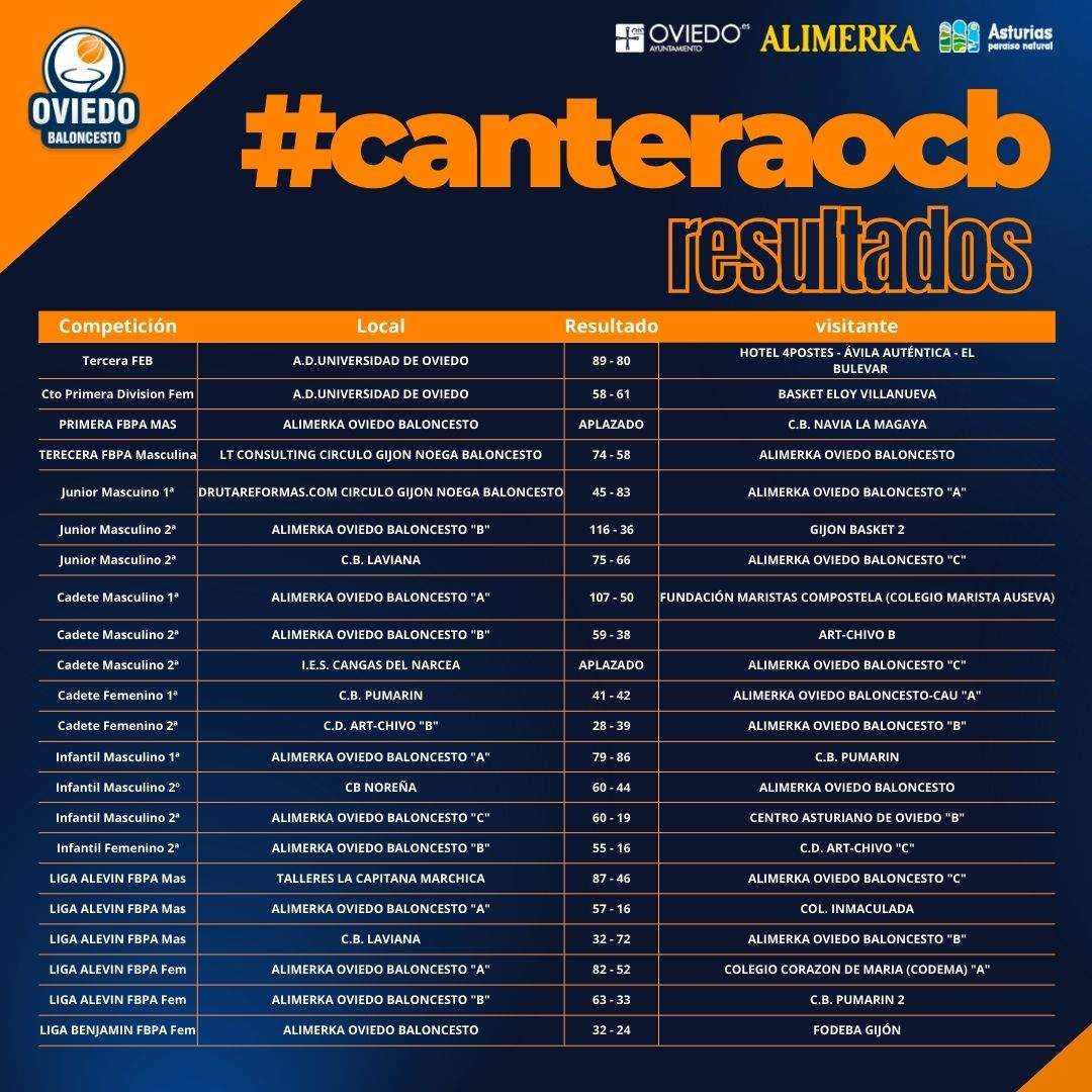 | Tercera FEB | A.D.UNIVERSIDAD DE OVIEDO | 89 – 80 | HOTEL 4POSTES – ÁVILA AUTÉNTICA – EL BULEVAR |