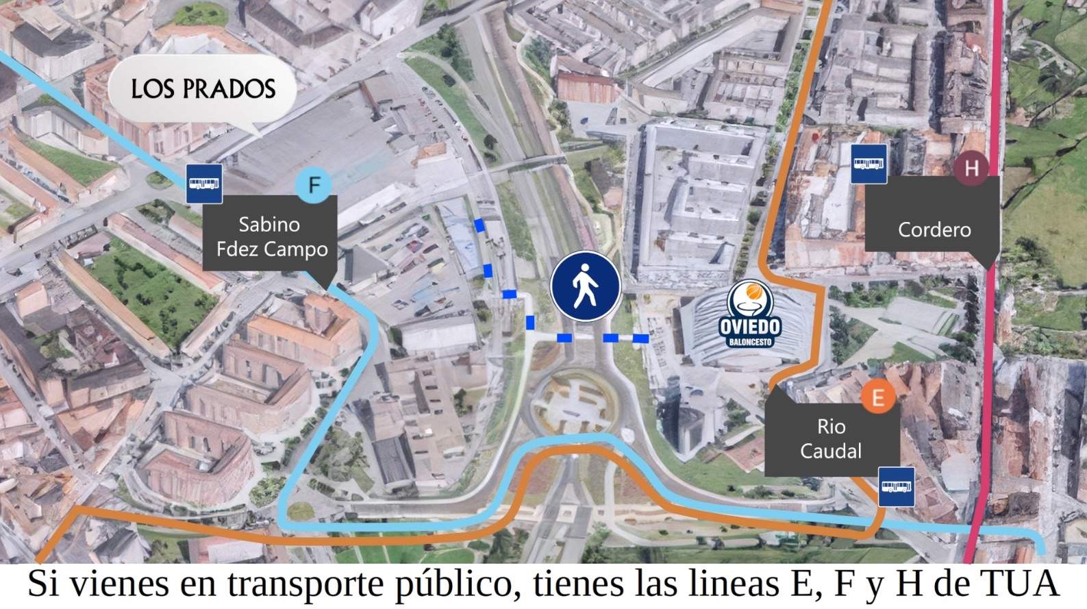 Se recomienda también que quienes puedan utilizar el servicio de transporte público para llegar a nuestra nueva casa, hagan uso de él. TUA ofrece hasta tres líneas de autobús urbano que tienen a disposición de los aficionados paradas próximas al Palacio. La Linea E (Las Campas-La Monxina) pasa por La Florida, Independencia o Pumarín y tiene una parada de la calle Río Caudal, a escasos 50 metros del Palacio de los Deportes. Para quienes lleguen a Oviedo en tren, la línea E también dispone de una parada a 200 metros de la estación de Renfe, en la calle Independencia.