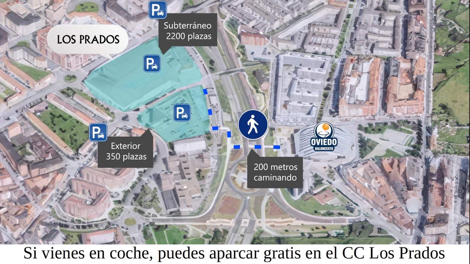 Por último, para quienes elijan acercarse en sus vehículos particulares, tanto desde Oviedo como de otros puntos de dentro o fuera de Asturias, la mejor opción es aparcar en las más de 2.500 plazas que el Centro Comercial Los Prados pone a disposición de los aficionados del OCB, tanto en el parking exterior como en las dos plantas subterráneas. Utilizando el paso de peatones que da acceso directo a la plaza exterior del Palacio desde las inmediaciones del parking exterior de Los Prados, el trayecto peatonal se reduce a menos de 200 metros.